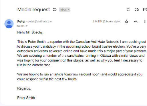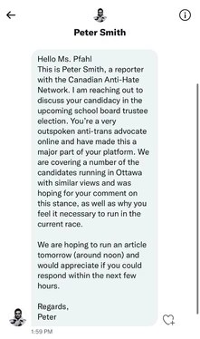 Not one to back down, Pfahl decided to run in the Ottawa School Board Trustee election. CAHN, of course, took issue with this and, on August 23, 2022, posted another piece smearing her and fellow candidate Shannon Boschy. Titled “Anti-Transgender Candidates Enter School Board Elections,” it gives the byline to the Canadian Anti-Hate Network, but it was Smith who reached out for a comment, calling both candidates “outspoken anti-trans advocate[s].”