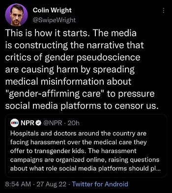 Outlets like NPR have also been pushing the idea that hospitals are facing harassment due to criticism for providing such treatments. On Twitter, evolutionary biologist Dr. Colin Wright of Reality’s Last Stand pointed out that this is a silencing tactic against legitimate concerns.